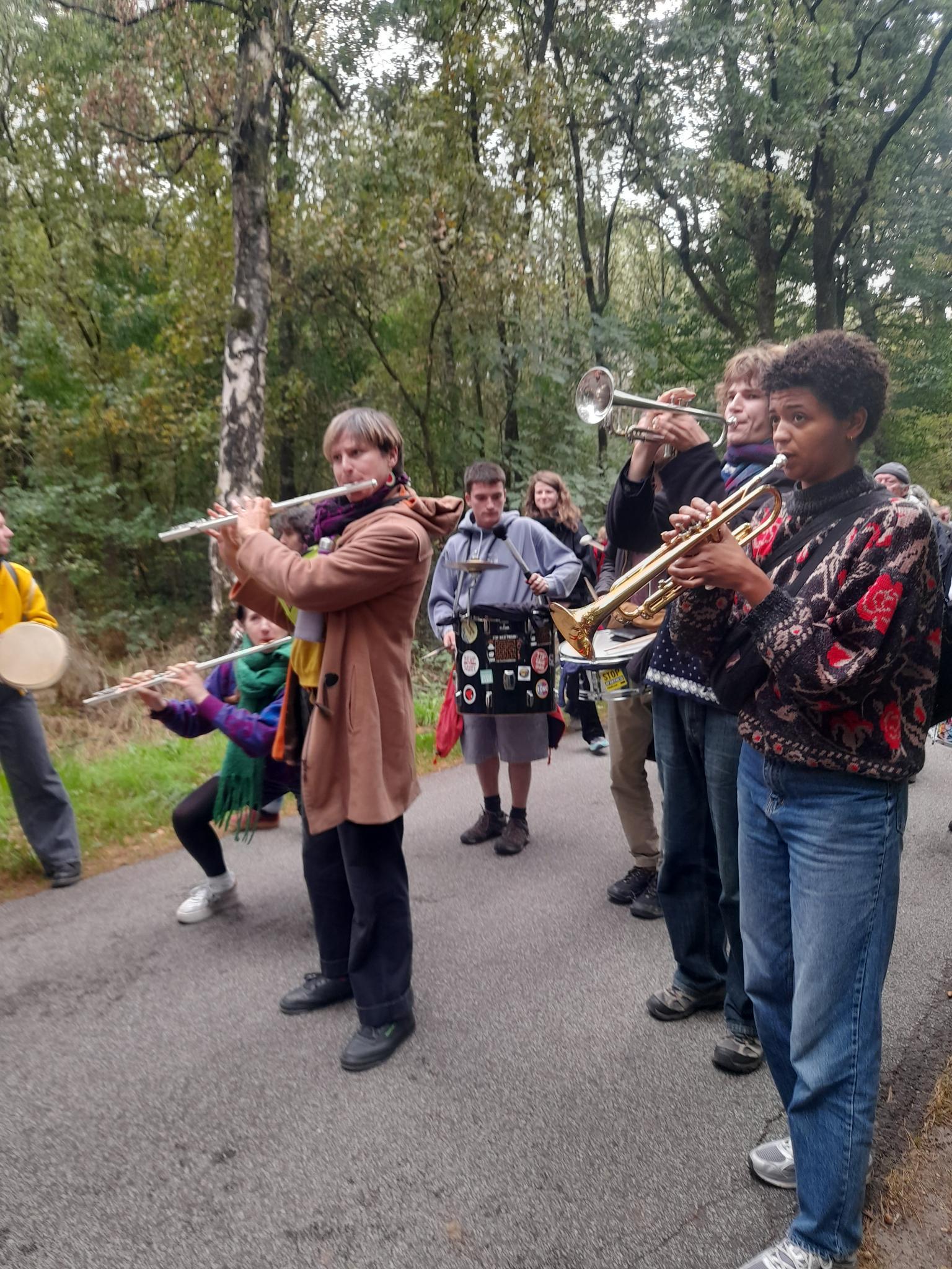 De kleurrijke optocht werd opgeluisterd door live muziek en onderbroken voor een hartige picknick en enkele toespraken. Onder meer Ludo De Brabander (Vrede vzw) en Samuel Legros (CNAPD) namen het woord met concrete eisen, zoals volledige transparantie over de aanwezigheid van VS-kernwapens op Belgische bodem. Sinds hun ontplooiing in 1963 weigeren opeenvolgende regeringen die aanwezigheid immers te bevestigen of te ontkennen. Dat is onaanvaardbaar in een democratie, zo luidde het.