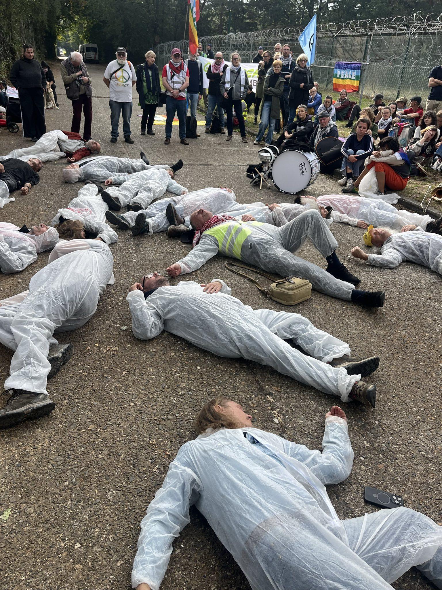 Aan het einde van de protestwandeling vormden de activisten een mensenketting aan de luchtmachtbasis en hielden ze een minuut stilte in acht voor alle slachtoffers van de atoomaanvallen in Japan, van de nucleaire proeven uitgevoerd door kernwapenstaten en van de slopende arbeid in de mijnen waar het uranium voor kernwapens wordt gedolven, zoals in Shinkolobwe in koloniaal België, waar het uranium vandaag kwam voor de bommen die Hiroshima en Nagasaki verwoestten.